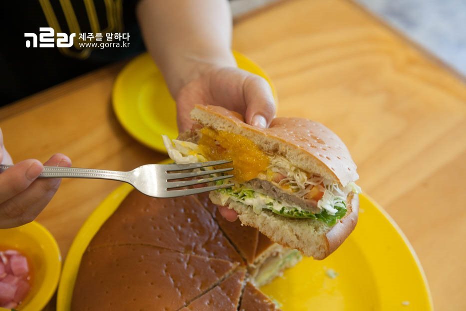 곤경에 빠진 버거는 4인용으로 한 조각이 성인 남성 손바닥 정도의 크기로 이미 많은 사람들에게 알려져 있답니다! 양상추와 흑돼지 패티, 치즈, 소스 등 차곡 차곡 들어가 있는 재료들이 환상의 조합을 이뤄내 곤경버거를 완성시킨답니다~