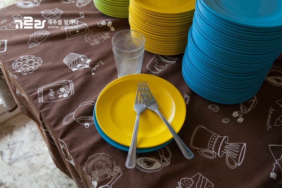 카운터에서 주문을 마치고, 한 쪽에 준비되어 있는 그릇과 포크를 챙겨 자리로 가면 맛있게 먹을 준비 완료! 곤경에 빠진 버거는 모두 셀프 이용이니 참고해주세요^^