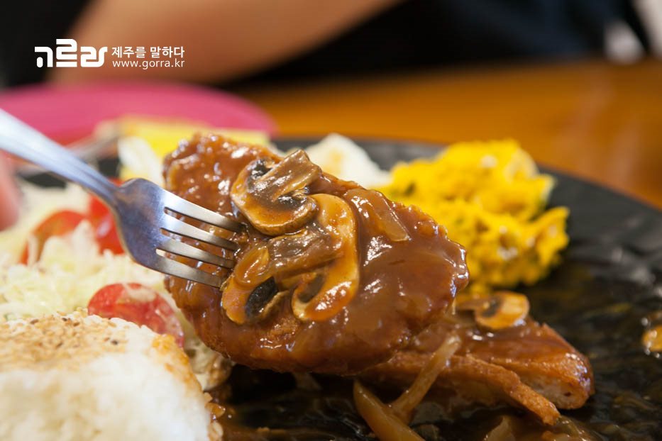 돈까스 세트는 제주산 흑돼지를 사용해 두툼한 게 특징! 그 위로 양송이가 가득 들어가 있는 곤경버거만의 특제 소스가 촤르르 뿌려져 나옵니다. 이곳은 소스부터 샐러드 소스까지 작은 것 하나도 직접 만들어 준비한다고 하는데요~