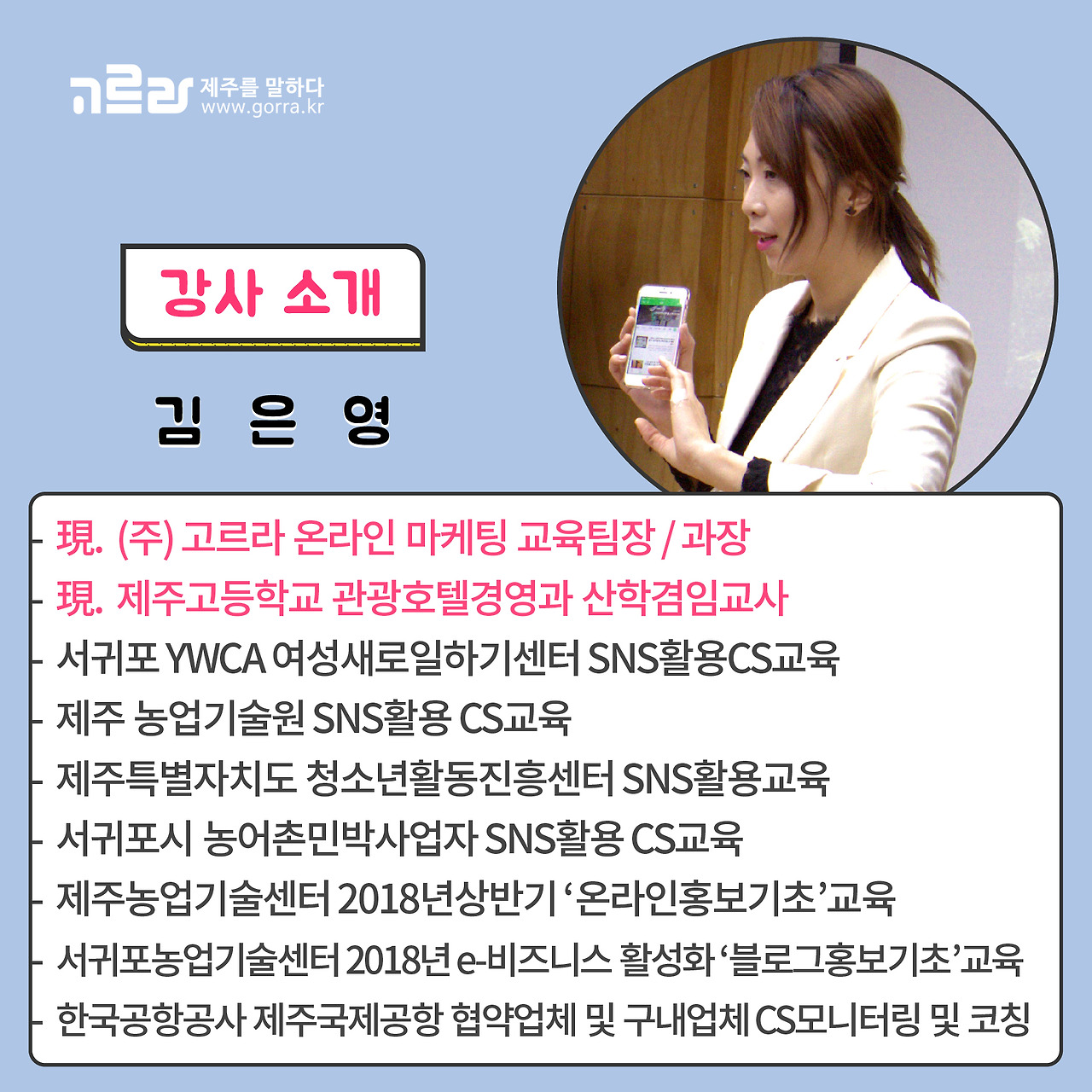 고르라제주의 온라인 마케팅 교육팀장 김은영 강사는 다양한 CS교육의 이력을 가지고 있으며 현재 제주고등학교 관광호텔경영과 산학겸임교사로 활동하고 있답니다~