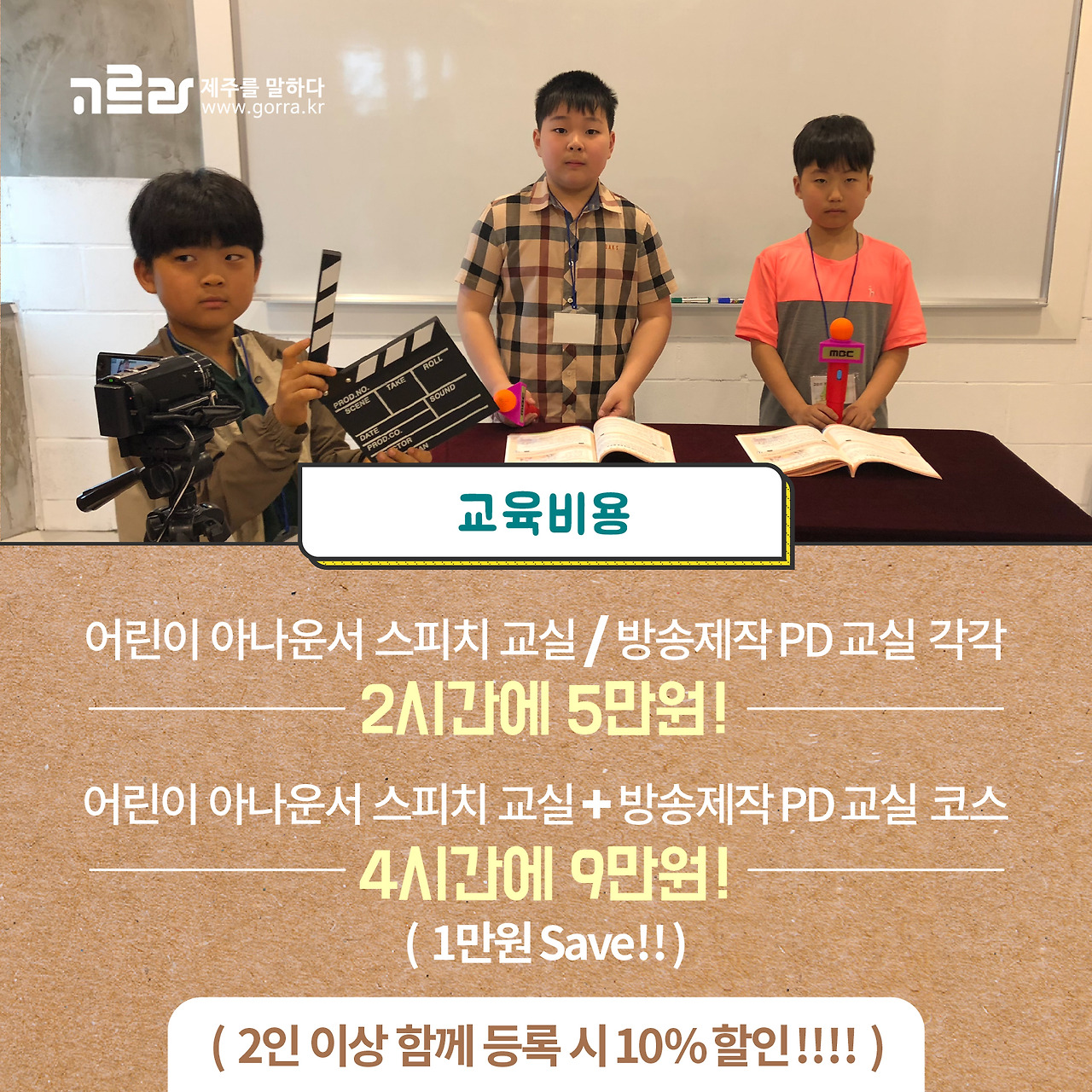 어린이 아나운서 교실과 방송제작 PD 교실 중 하나만 수강신청을 하실 경우는 5만원! 두 가지 수업을 모두 받기를 원하신다면 1만 원이 할인된 가격인 9만 원으로 가능하다는 점! 확인해주세요^^ 또한 2인 이상 함께 등록 시 여기에 또 10% 할인된 금액으로 특강을 받아볼 수 있으니 많이 많이 함께하면 좋겠죠?