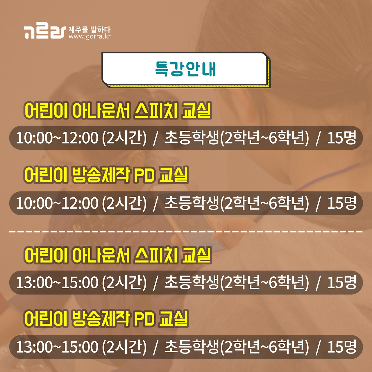 오전, 오후로 나눠서 열리는 어린이 아나운서 스피치 교실과 어린이 방송제작 PD교실은 약 2시간동안 진행될 예정이며, 한 클래스 별로 15명 정도의 인원이 함께 하게 됩니다.