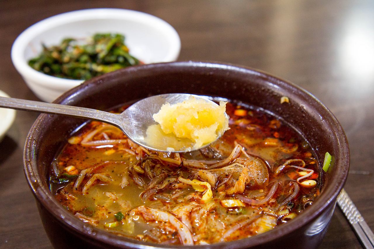 다진 마늘을 취향껏 넣어먹는 것도 더 맛있는 해장국을 위한 미풍해장국만의 꿀팁! 다진 마늘을 살살 풀고 함께 나온 양념 부추도 넣으면 맛있게 먹을 준비 끝!