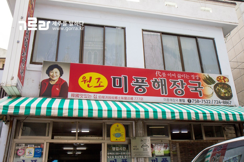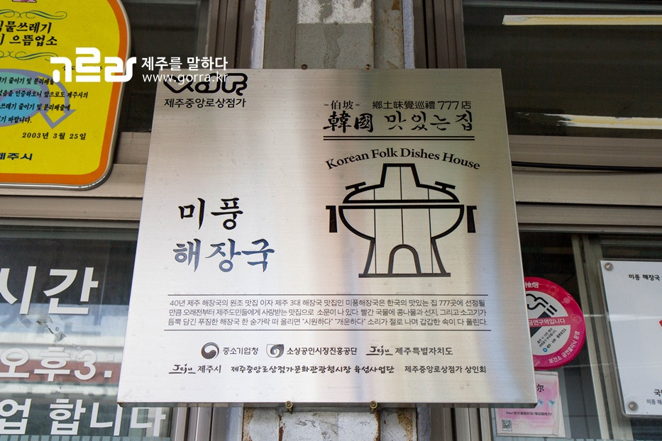 제주시 중앙로 상점가 골목에 위치한 미풍해장국. 중앙로 상점가의 수많은 먹거리 중 가장 인기 있는 곳이랍니다. 식당 내부는 40년의 세월을 그대로 옮겨놓은 듯 보이지만 부지런한 사장님의 손길로 깔끔하게 유지되고 있습니다.