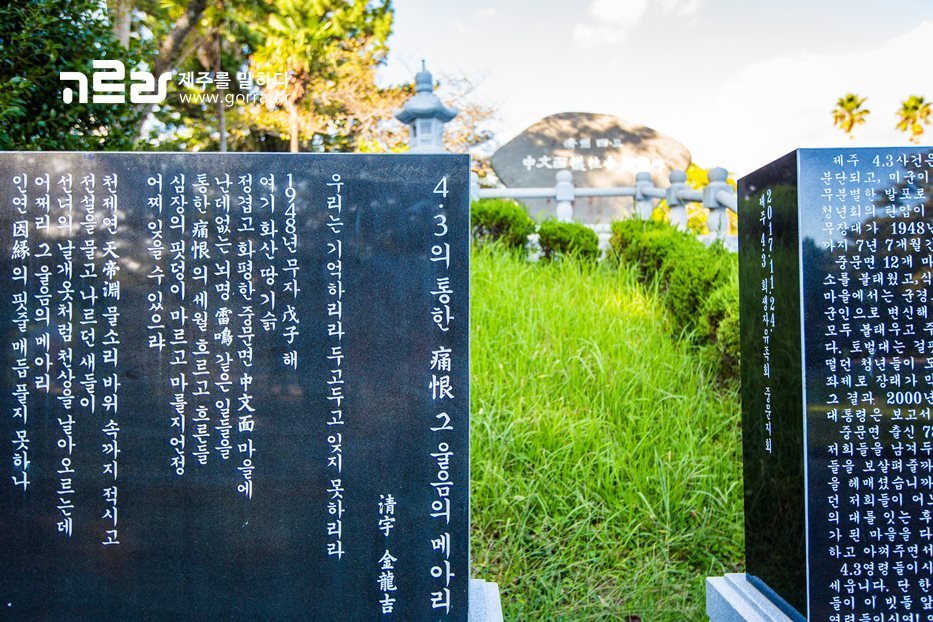 중문관광단지 입구에 있는 천제연 폭포는 제주를 대표하는 명승지이다. 이곳에 가서 보면 절로 숙연해지는 것이 있으니 바로 4.3 희생자 위령비다. 과거에는 소나 돼지를 잡는 장소로도 사용이 되기도 했던 천제연 폭포의 주차장.