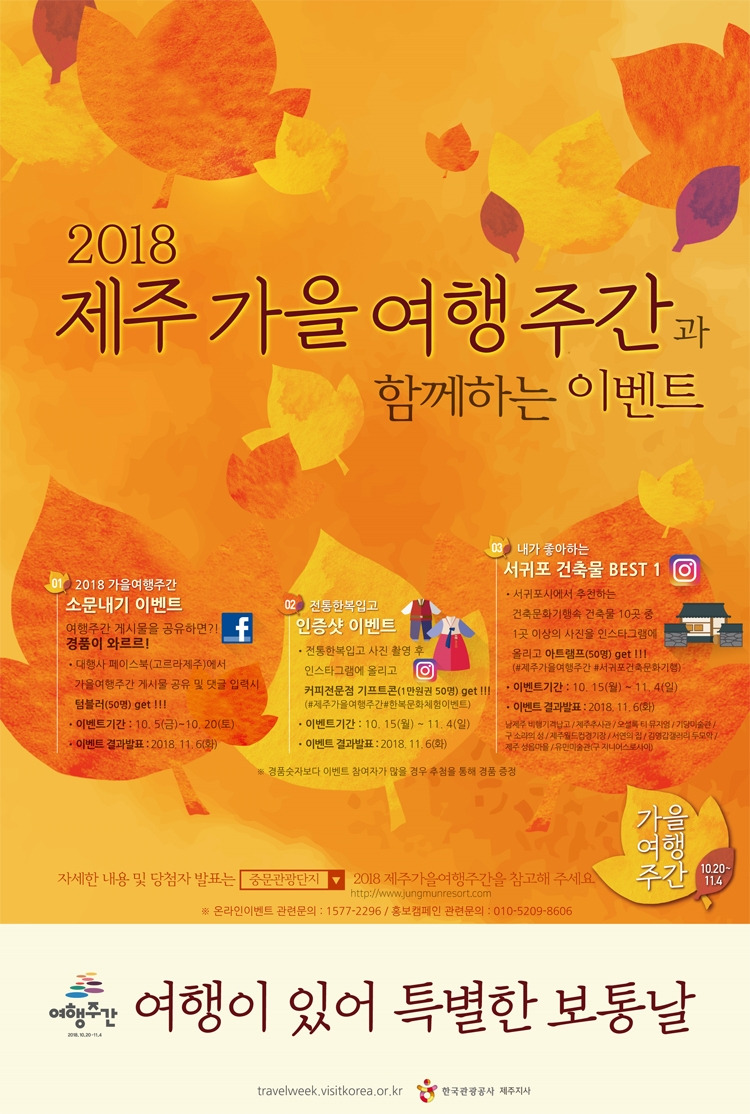 한국관광공사 제주지사와 서귀포시에서는 2018 제주 가을 여행주간을 맞아 10월 20일부터 11월 4일까지 다양한 이벤트를 진행한답니다~