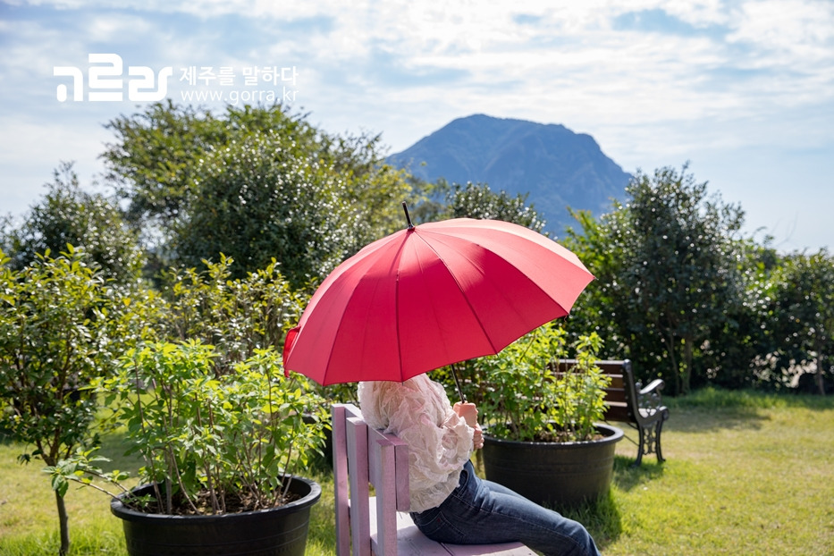 2000여 평의 대지위에 지어진 카페로 넓은 정원에서 다양한 꽃을 볼 수 있고, 탁 트인 산방산 전망이어서 사진 찍기에 최고랍니다! 뜨거운 햇살 걱정은 노노~ 카페 입구에 빨간 양산이 준비되어 있어 든든하답니다.