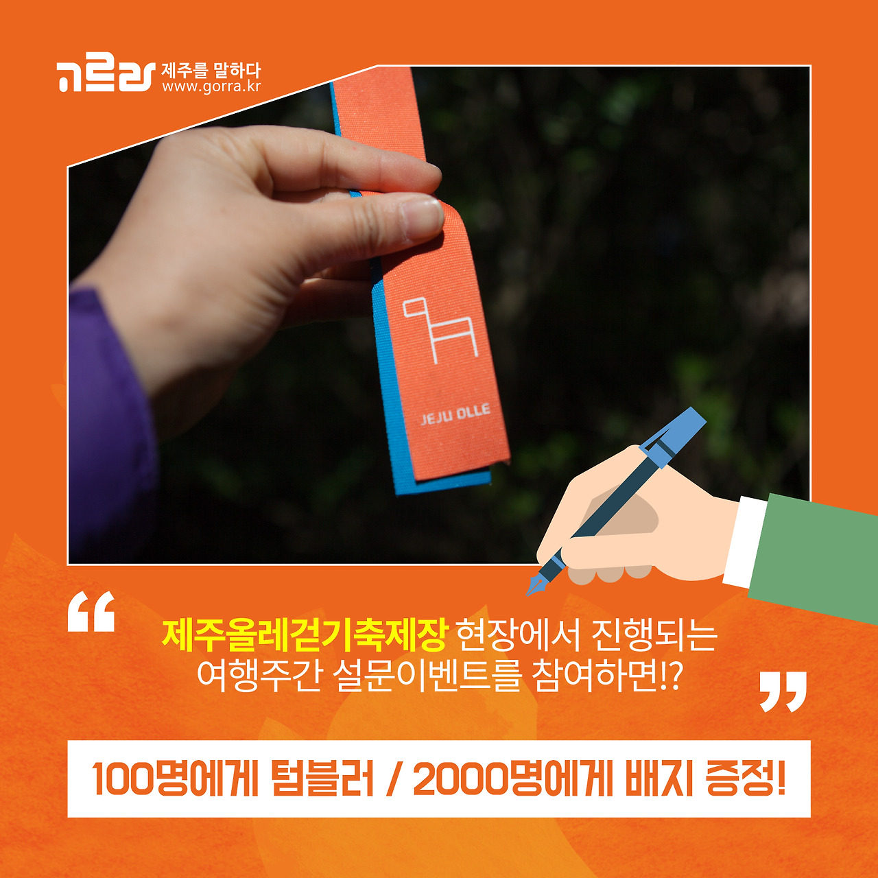 첫째 날 제주올레 걷기 축제장 출발점에 있는 가을여행주간 홍보부스에 찾아가시면 캐릭터 인형과 사진 찍기가 진행되며, 뿐만 아니라 가을여행주간 설문 이벤트를 통해 100명에게 텀블러, 2000명에게 배지가 증정된답니다!