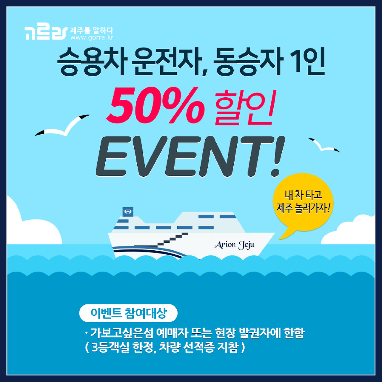 한 시간이면 비행기 타고 이동할 수 있지만 때로는 배를 타고 바다를 바라보며 여유를 즐겨보는 건 어떨까요? 그곳에 남해고속 아리온제주가 함께합니다! 승용차 운전자, 동승자 할인 이벤트에 참여할 수 있는 기회도 놓치지 마시고 즐거운 여행 되시길 바랍니다^^
