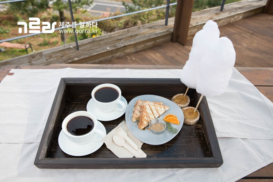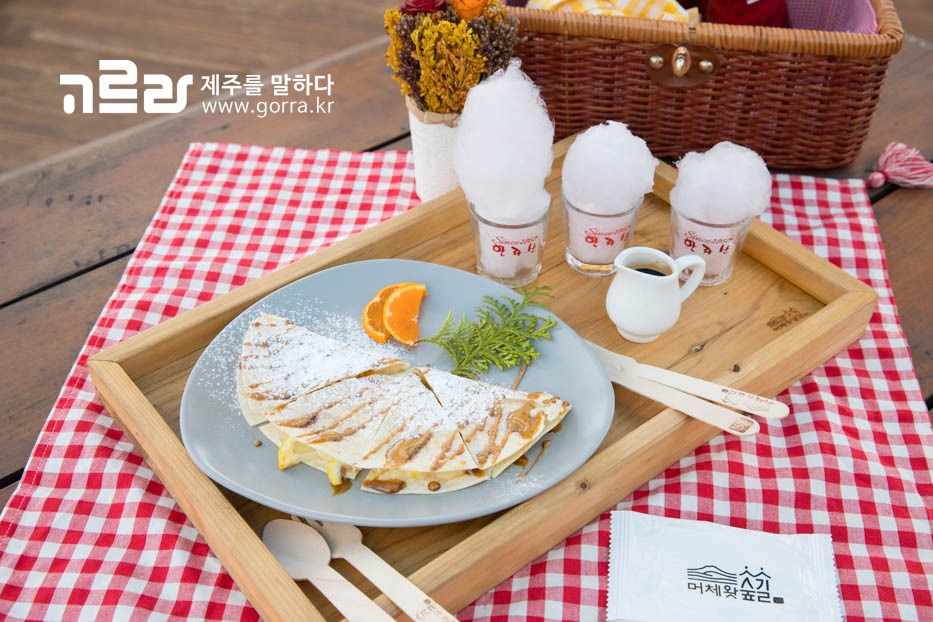 달콤한 솜사탕을 곁들인 커피 또한 머체왓의 매력적인 메뉴인데요. 황칠과 편백나무 알갱이가 들어있는 편백밀크티잼은 머체왓에서만 맛볼 수 있답니다. 머체왓숲길에서는 대부분이 친환경으로 제작되며 먹거리는 모두 로컬푸드라는 점!