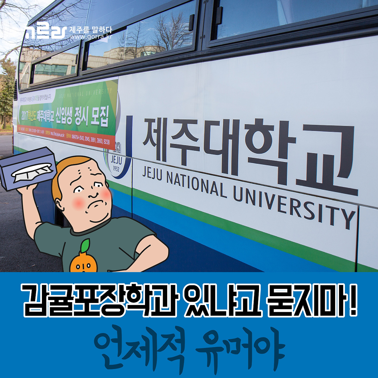 제주도 하면 귤을 빼놓을 수 없는데요. 아마도 전국에서 제주의 감귤이 가장 유명한 덕분이겠죠^^ 그렇지만 제주대학교에 감귤포장학과가 있는 건 아니랍니다! 예전부터 전해오는 썰렁한 유머라지만, 혹시 아직도 제주대와 한라대에 다닌다고 해서 감귤포장학과냐고 장난치시는 분들은 없겠죠?