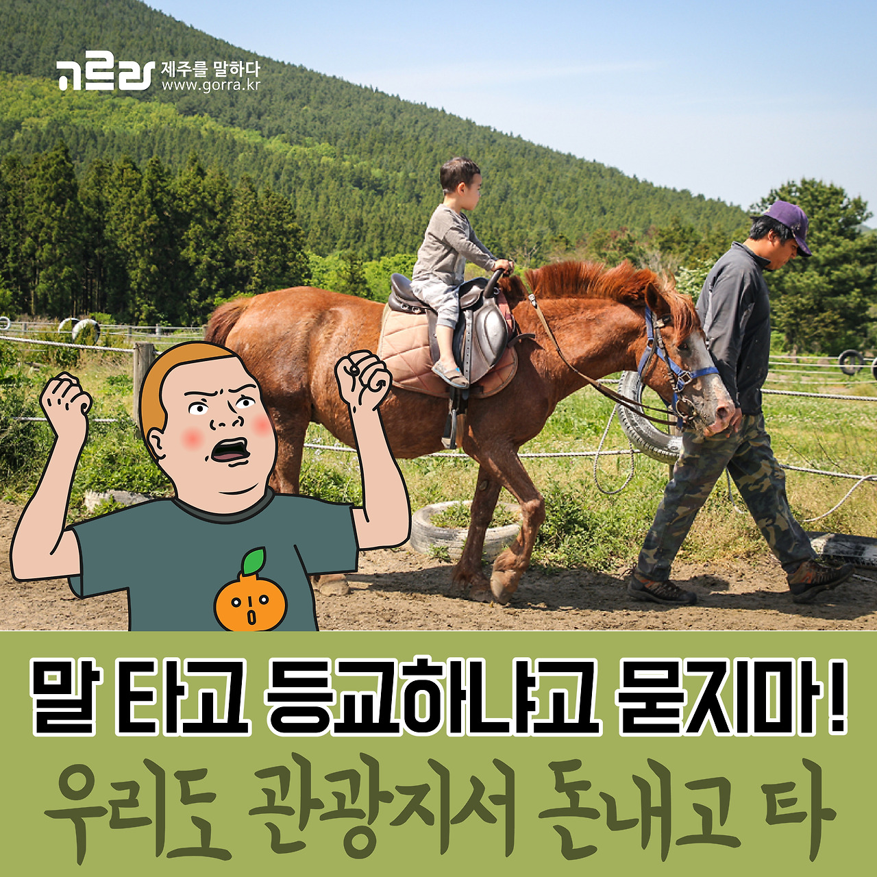 "사람을 낳으면 서울로 보내고, 말을 낳으면 제주로 보내라" 그만큼 제주도의 말은 천연기념물 제347호로 지정되어 있을만큼 귀하답니다. 그렇기 때문에 제주도에 산다고 해서 집집마다 말을 키운다던가, 쉽게 탈 수 있는 건 아니겠죠? 제주도민들도 관광지에 가서 돈 내고 탄답니다!