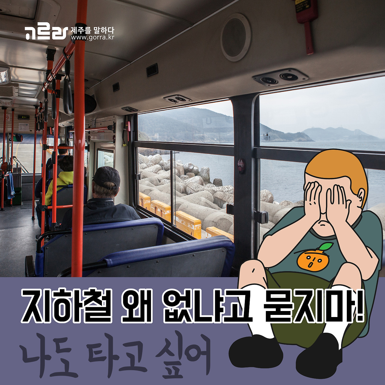 제주에는 다른 지역들과는 다르게 지하철이 없답니다. 그렇기에 제주 여행시 많은 분들이 버스와 렌트카를 이용한다지요~ 그런데 제주에 지하철이 없는 이유 속에는 제주의 아름다운 자연을 훼손할 수 없다는 깊은 뜻이 담겨 있습니다. 지하철이 없기 때문에 우리는 아름다운 제주를 계속 만날 수 있는 것이라죠^^