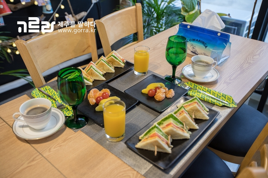 1층 카페테리아에서는 수제 샌드위치, 커피, 주스, 과일이 제공되는 조식 서비스까지! 아침 8시 30분부터 9시 30분까지 1인 5,000원에 제공되며, 조식 이용 시 미리 신청해야 한다는 점 참고해주세요.