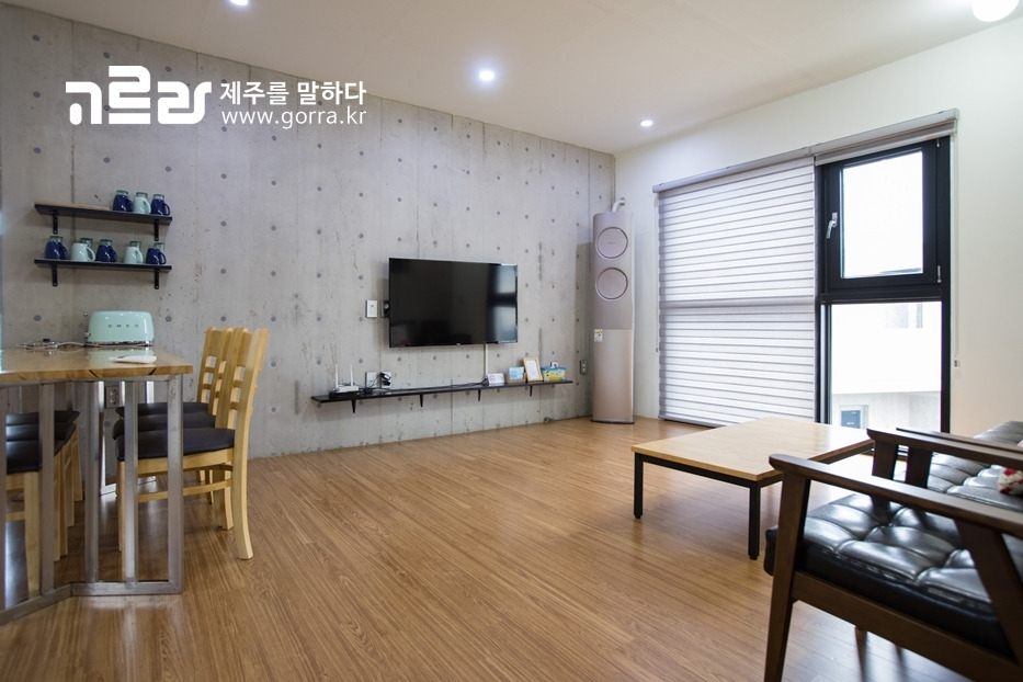 넓고 깔끔한 거실에는 50인치 벽걸이 TV, 무풍 에어컨, 소파, 테이블 등이 있어 편안하게 휴식을 즐길 수 있습니다.