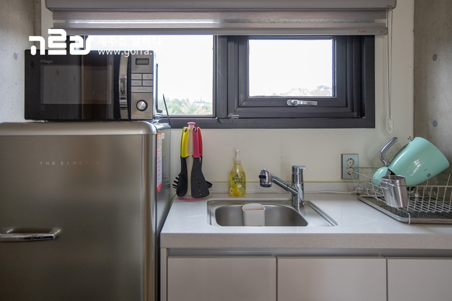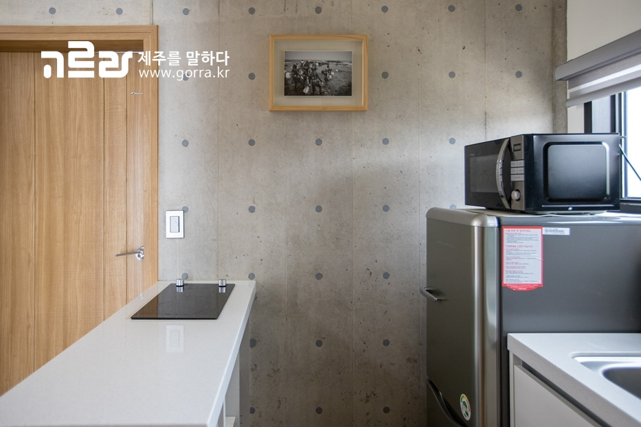 주방에는 싱크대, 냉장고, 전자레인지, 2구 전기레인지, 압력밥솥, 그리고 식기와 수저가 마련되어 있어 간단한 조리를 하기에 충분하답니다.