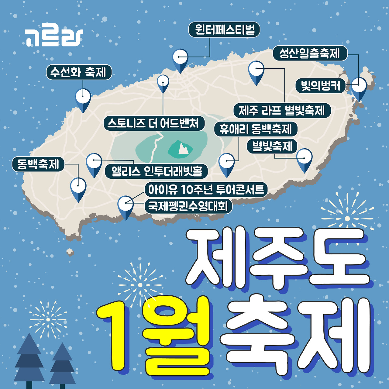 고르라 구독자 여러분, 2019년 새해가 밝았습니다♬ 모두 새해 첫 일출보며 소원도 빌고 새해 계획도 세워보셨나요? 새해를 맞이해 가족, 친구, 연인과 함께 여행을 떠나는 분들을 위해 제주도의 1월 축제와 전시를 모아 모아 소개하려고 합니다. 이번 1월에는 제주도에 어떤 축제가 열릴까요?