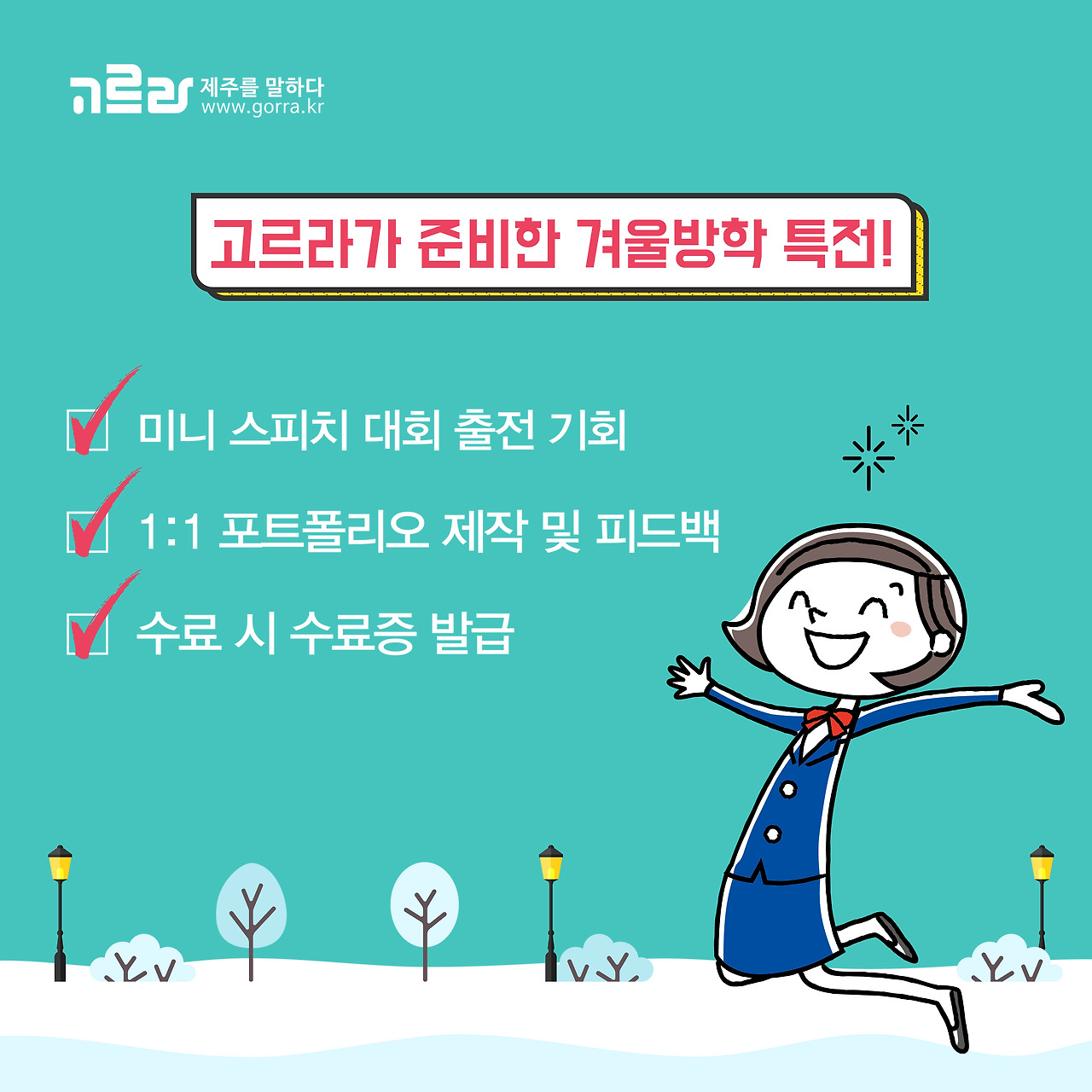 새롭게 변화된 수업 내용과 함께 고르라에서는 1월 수강생들을 위해 다양한 특전을 마련해 두었는데요~ 미니 스피치 대회 출전 기회, 1대1 포트폴리오 제작 및 피드백, 수료 시 수료증 발급 등 다채롭게 준비했답니다^^