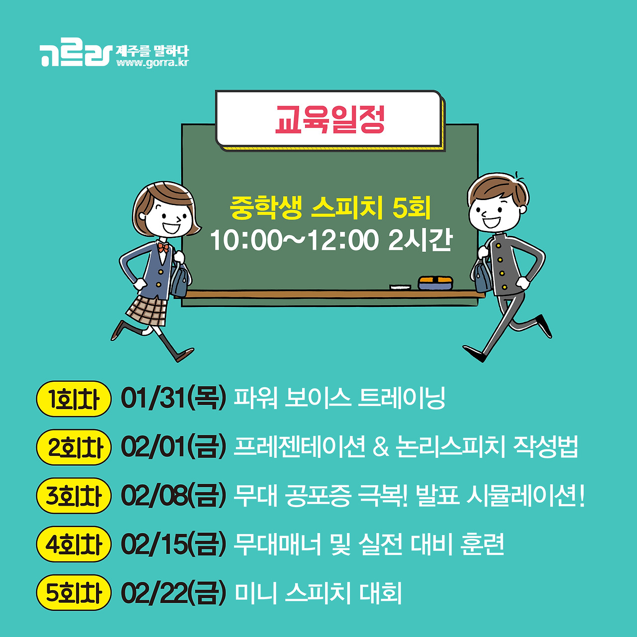다음으로는 중학생 스피치 강의! 중학생 스피치 수업 또한 5회차로 진행되며, 수업시간은 오전 10시부터 오후 12시까지인데요~ 1월 31일부터 2월 22일까지 일주일에 한 번씩 만나볼 수 있답니다~
