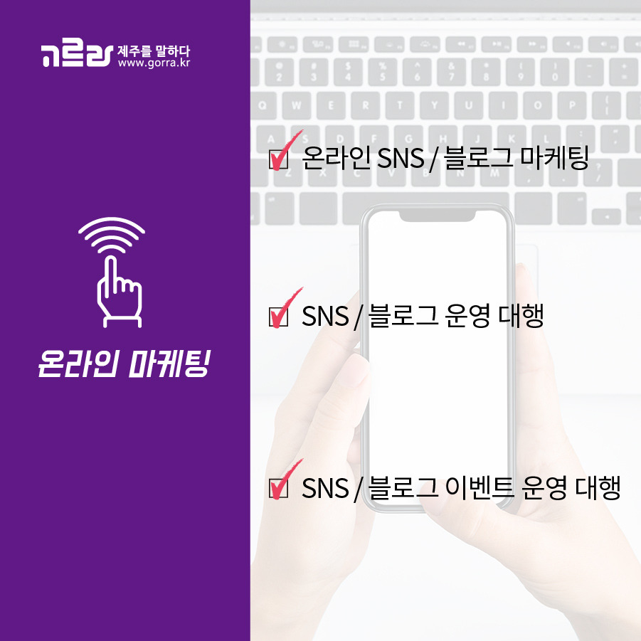 영상, 카드뉴스, 블로그 마케팅, 블로그&SNS 운영대행, 이벤트 운영대행 등의 다양한 작업을 하고 있습니다. 다양한 컨텐츠와 폭넓은 타켓층과의 소통을 위해 힘쓰고 있는 고르라의 온라인 마케팅 사업부가 궁금하시다면 문의주세요~!