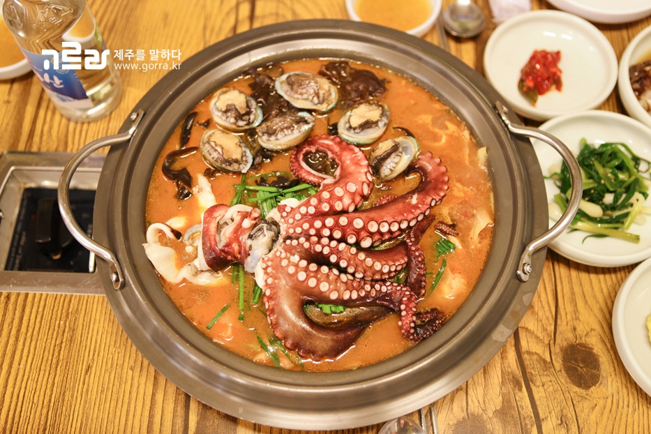 올랭이와물꾸럭은 시원하고 칼칼하게 끓여낸 해물탕과 궁극의 볶음밥을 맛볼 수 있는 맛집인데요. '올랭이'와 '물꾸럭'은 각각 '오리'와 '문어'를 일컫는 제주어랍니다! 큼직한 문어와 오리, 활전복을 듬뿍 넣은 해물탕은 훌륭한 안주가 됩니다.
