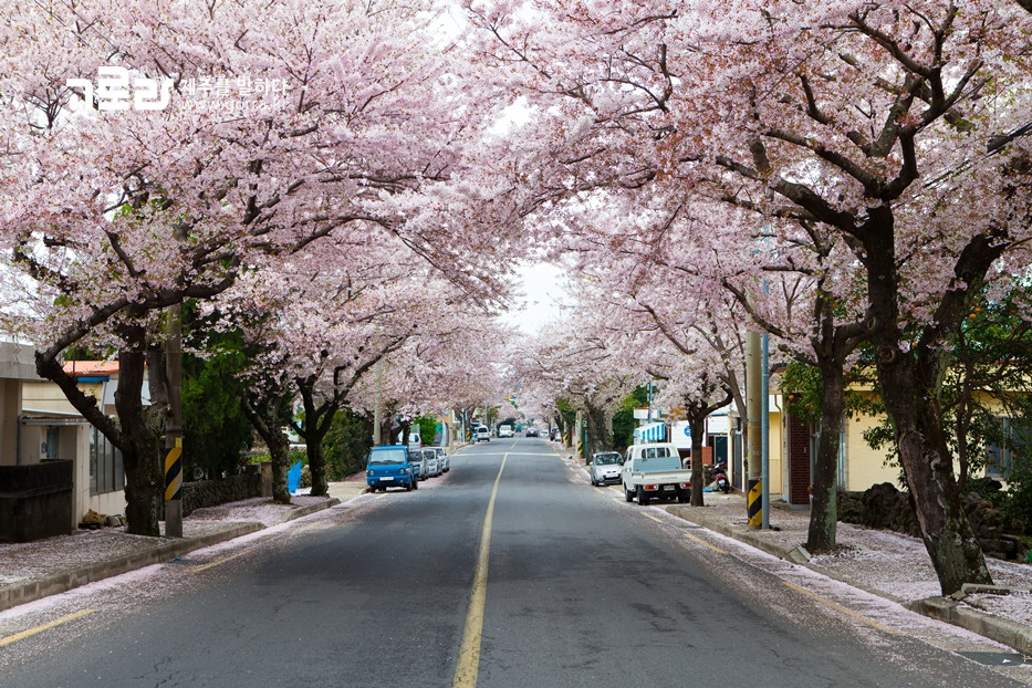 동백꽃으로 유명한 서귀포시 위미리. 그.런.데. 이곳은 사실 아는 사람만 안다는 벚꽃 명소라는 사실! 3월말이 되면 활짝 만개한 벚꽃나무들이 도로를 따라 늘어서는데요. 한가로운 위미마을의 정취와 꽃길이 어우러져 “봄이다!”라는 말이 절로 나온답니다.