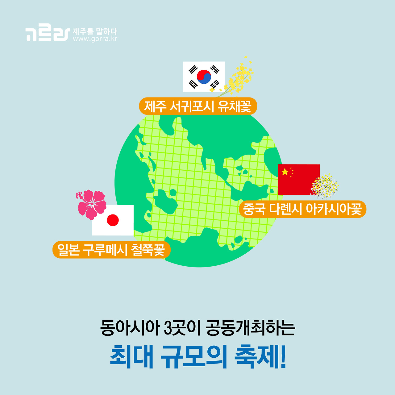 특히 제21회 서귀포유채꽃국제걷기대회는 대한민국 서귀포시와 일본 구루메시(철쭉), 중국 다롄시(아카시아꽃)에서 공동으로 개최하는데요. 3개국 3개 도시에서 ‘동아시아 플라워 워킹리그’를 결성, 평화와 화합을 도모하기 위해 개최하는 뜻깊은 행사랍니다.
