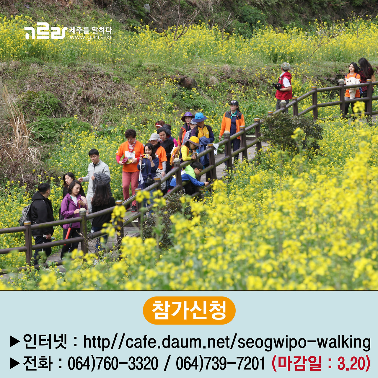 ‘2019 제21회 서귀포유채꽃국제걷기대회’가 약 한 달 앞으로 다가왔습니다. 올해 행사는 걷기, 공연, 체험행사 등 다채로운 프로그램으로 꾸려지는데요. 무르익은 제주의 봄길을 함께 걸으며 건강과 추억을 챙겨보는 건 어떨까요?