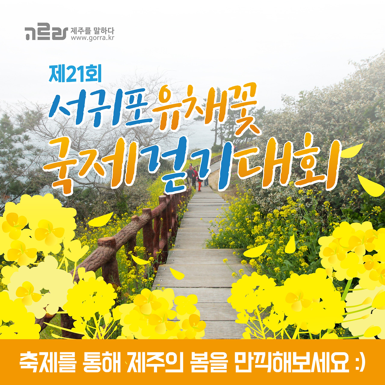 3월은 국경 없이, 차별 없이 제주의 봄길 위에서 모두가 하나 되는 '제21회 서귀포유채꽃국제걷기대회'가 열리는 달이랍니다. 대회는 2019년 3월 23일 토요일부터 3월 24일 일요일까지 서귀포시 일원에서 열리는데요. 개최일이 이틀 앞으로 성큼 다가왔네요.
