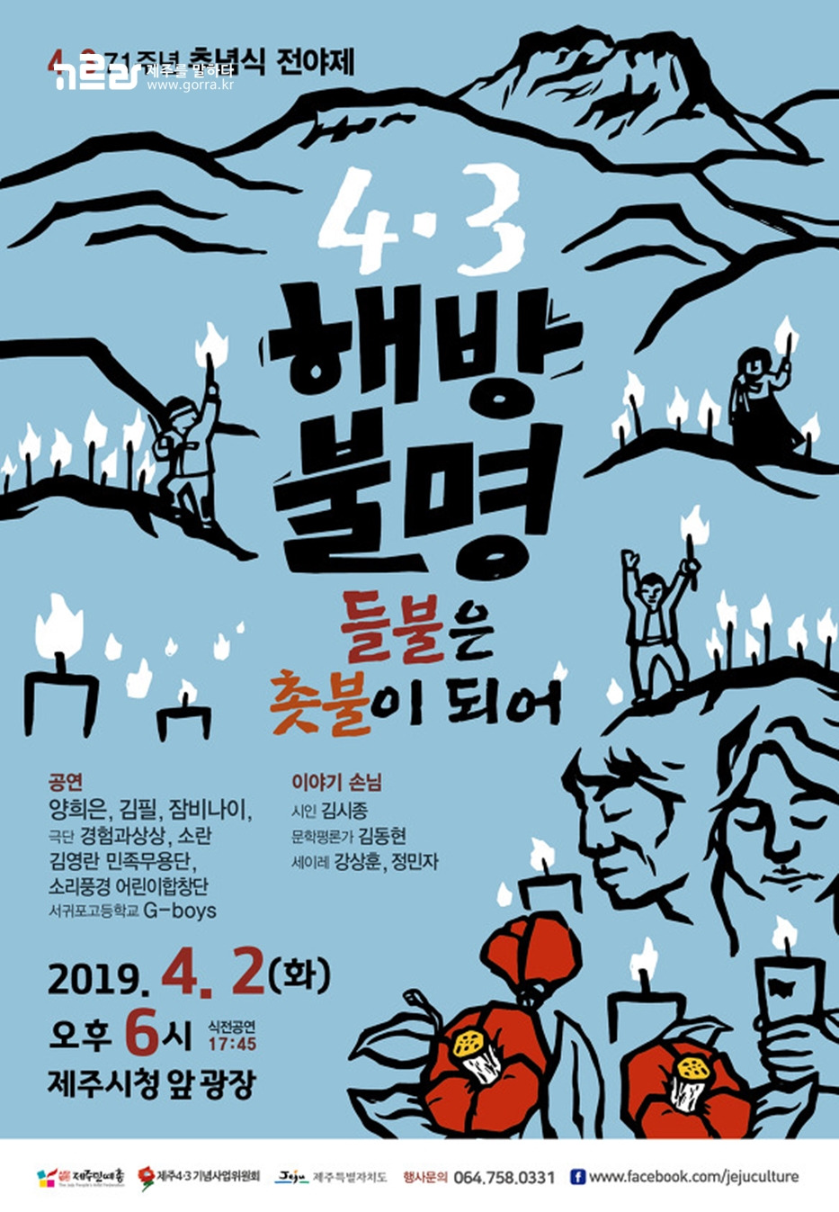 제주4.3사건이 올해로 71주년을 맞았죠. 이에 발맞춰 ‘2019 4.3항쟁 71주년 문화예술축전’이 ‘4.3해방불명-들불은 촛불이 되어’를 주제로 제주에서 펼쳐질 예정이에요. 특히 전야제에는 양희은, 김필 등이 참여해 음악을 통해 역사의 아픔을 보듬을 예정이랍니다.