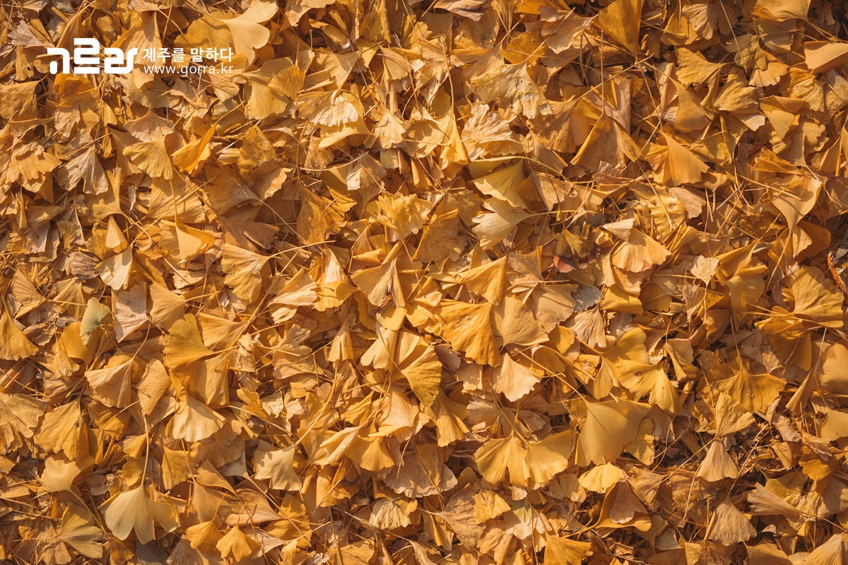 제주에는 전체적으로 은행나무가 많지 않습니다. 가을 은행나무길로 손꼽히는 곳들을 뽑자면 제주대학교 은행나무길 정도로 은행잎이 길에 가득 내려 눈처럼 쌓인 것은 제주에서는 찾아보기 힘든 풍경 중 하나랍니다.
