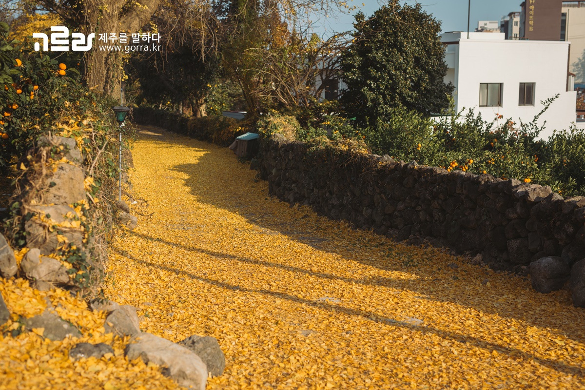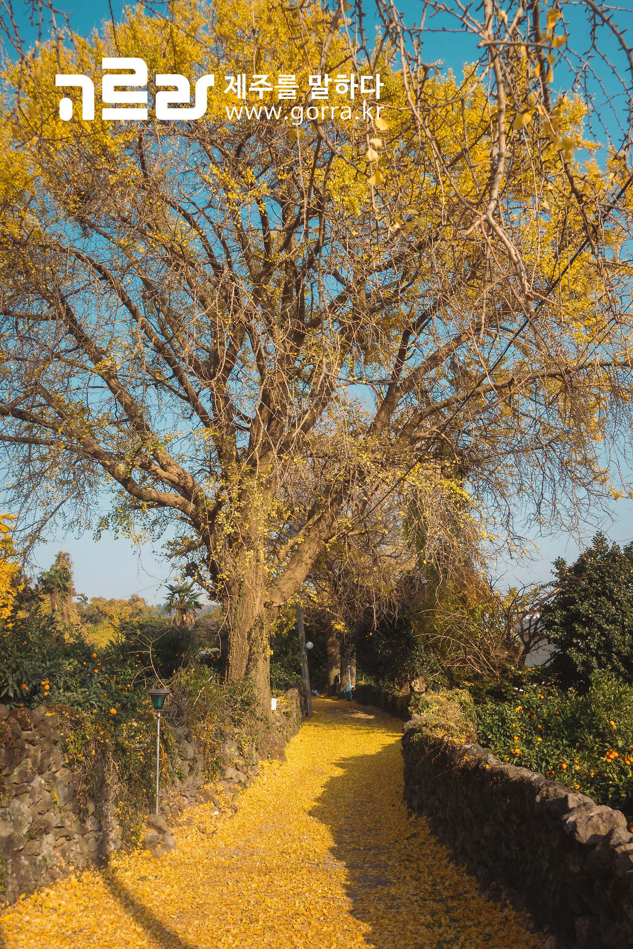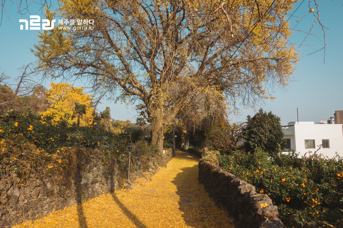 작은 골목길 사이로 펼쳐진 은행나무길. 작은 돌들이 차곡차곡 담을 이루어 제주스러운 가을 풍경을 볼 수 있답니다. 여기에 그 돌담 안쪽으로 펼쳐진 은행잎보다 더 진한 노란색을 띤 귤밭이 제주도의 12월을 더 노랗게 물들여 주는데요.