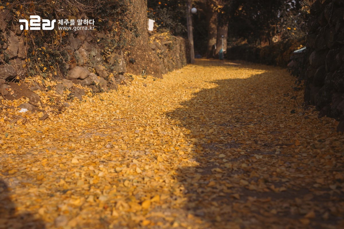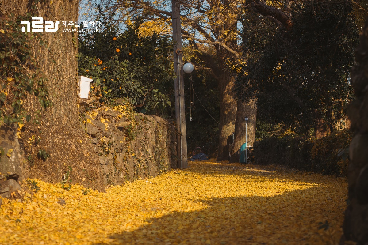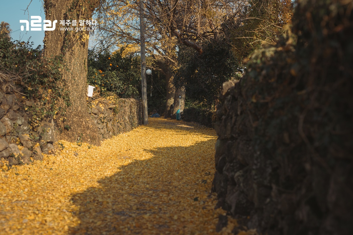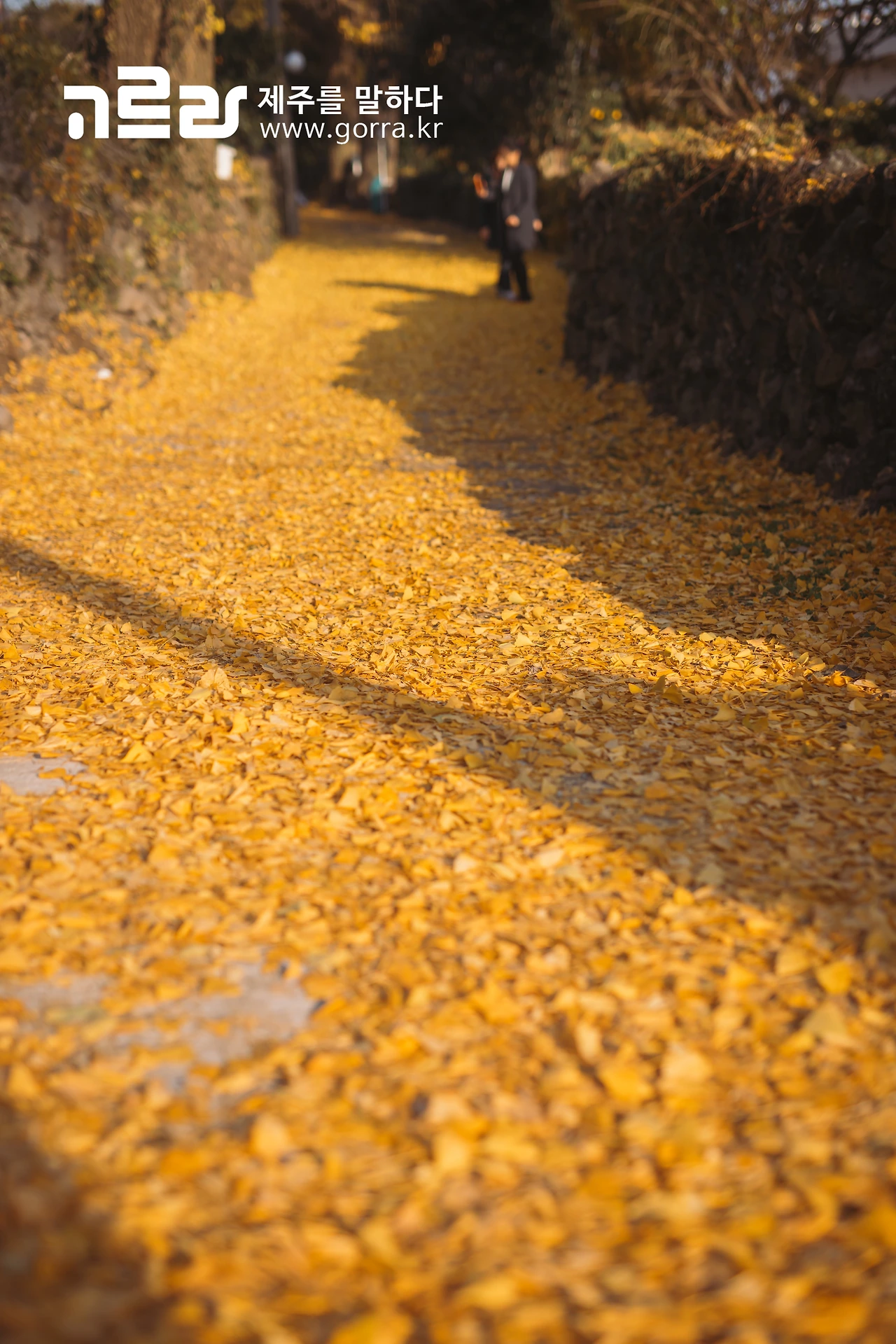 작은 골목길 사이로 펼쳐진 은행나무길. 작은 돌들이 차곡차곡 담을 이루어 제주스러운 가을 풍경을 볼 수 있답니다. 여기에 그 돌담 안쪽으로 펼쳐진 은행잎보다 더 진한 노란색을 띤 귤밭이 제주도의 12월을 더 노랗게 물들여 주는데요.