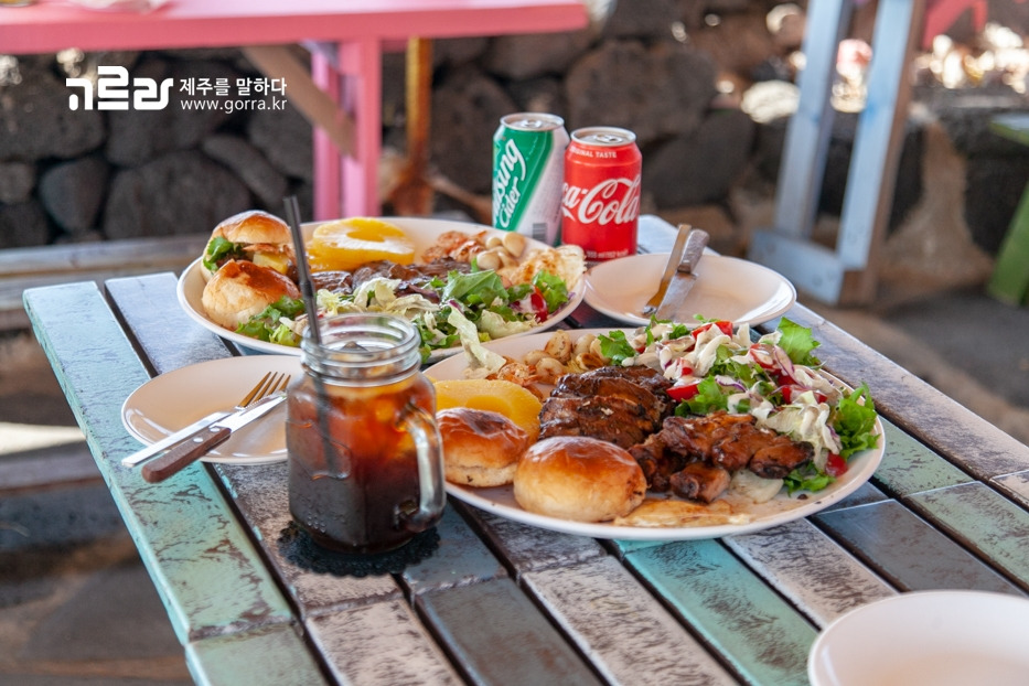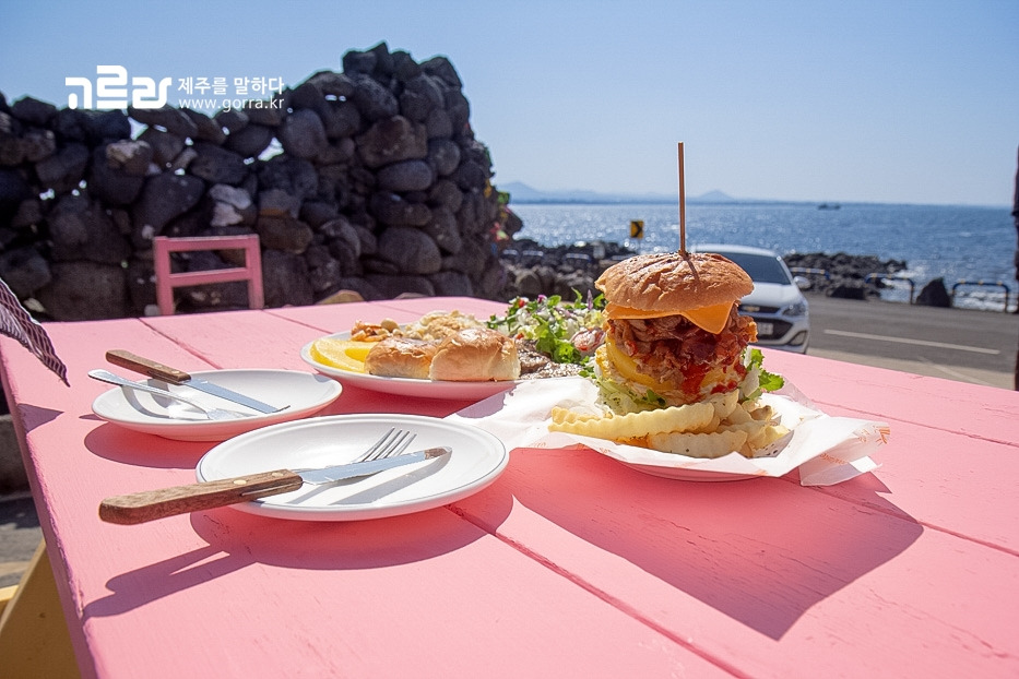 제주도야지등갈비스테이크, 흑돼지목살스테이크, 수제버거, 우도햇땅콩아이스크림 등 우도와 제주에서 가장 맛있게 먹을 수 있는 음식들을 판매하는데요. 내부와 외부 모두 테이블이 마련돼 있어 야외에서 바다를 바라보며 식사할 수 있는 곳이에요.