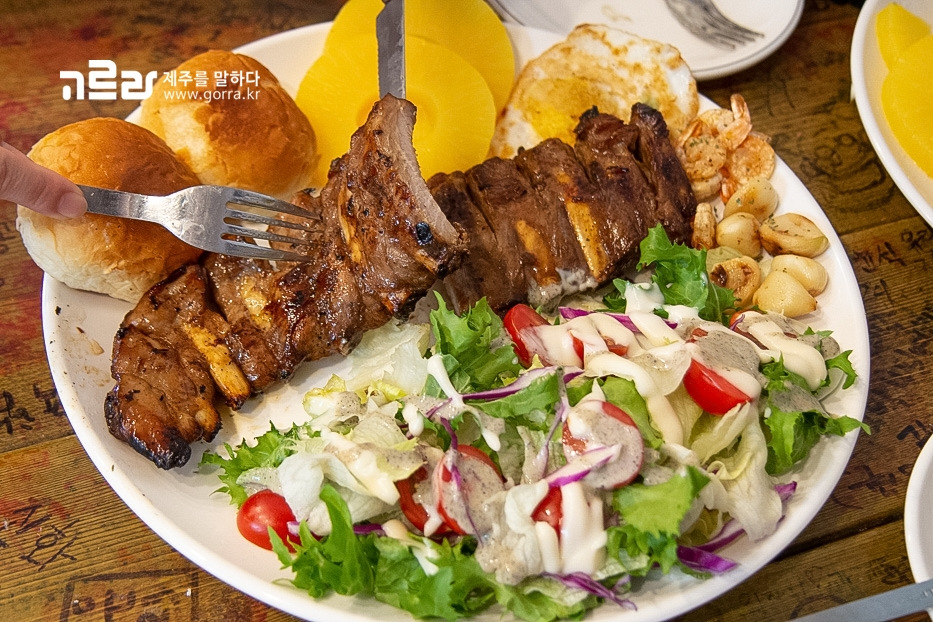 제주도야지등갈비스테이크는 CF에서 볼법한 비주얼로, 음식이 나오는 순간 눈이 동그레해진답니다. 평소 등갈비나 고기를 좋아한다면 더욱 맛있게 먹을 수 있는 메뉴인데요.