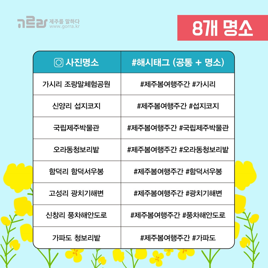이벤트 기간은 2019 봄 여행주간인 4월 27일부터 5월 12일까지랍니다. 참여 방법은 간단한데요. 봄 여행주간 8개 명소에서 찍은 사진이 있다면, 명소별로 제시된 해시태그와 함께 인스타그램에 전체 공개로 업로드하면 끝이랍니다.