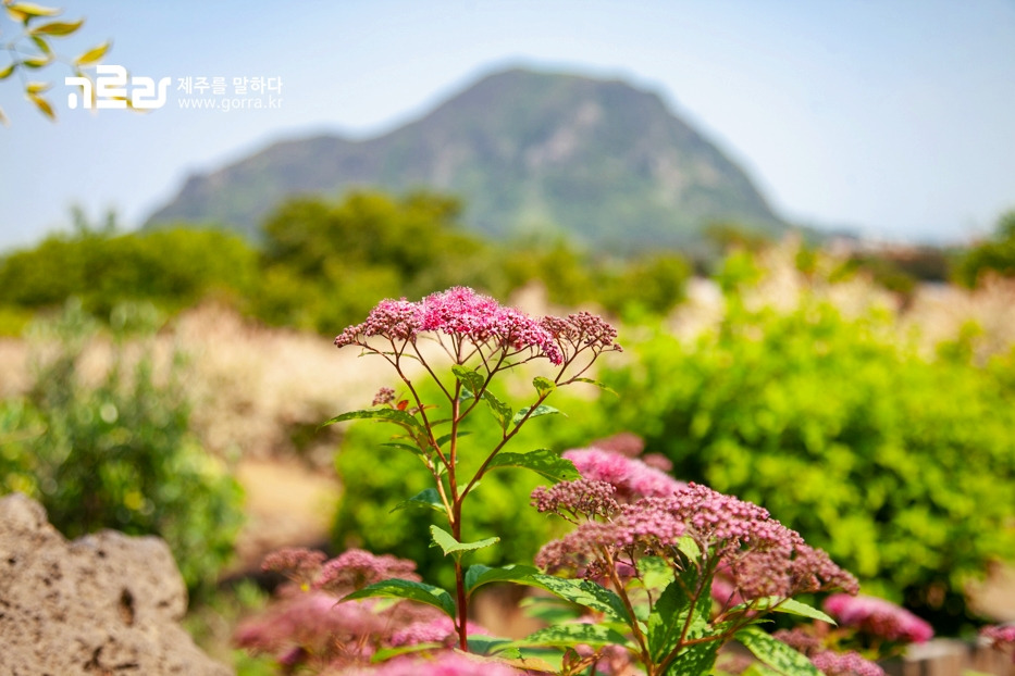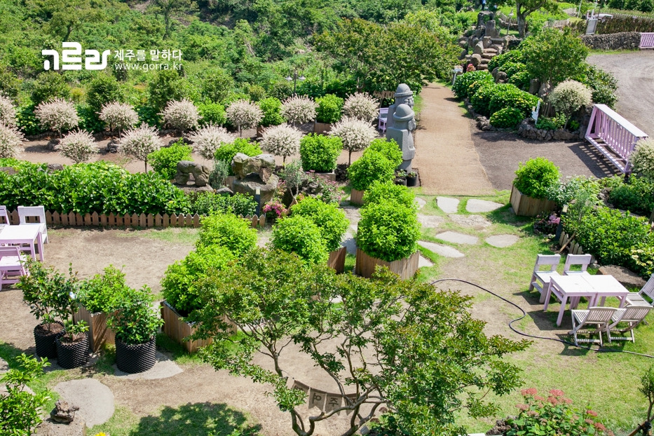 정원을 거닐다 주위를 둘러보면 한라산, 산방산, 군산, 형제섬이 모두 내다보이는데요. 푸른 하늘과 녹음의 산방산을 배경으로 인생샷을 남겨보는 건 어떨까요?