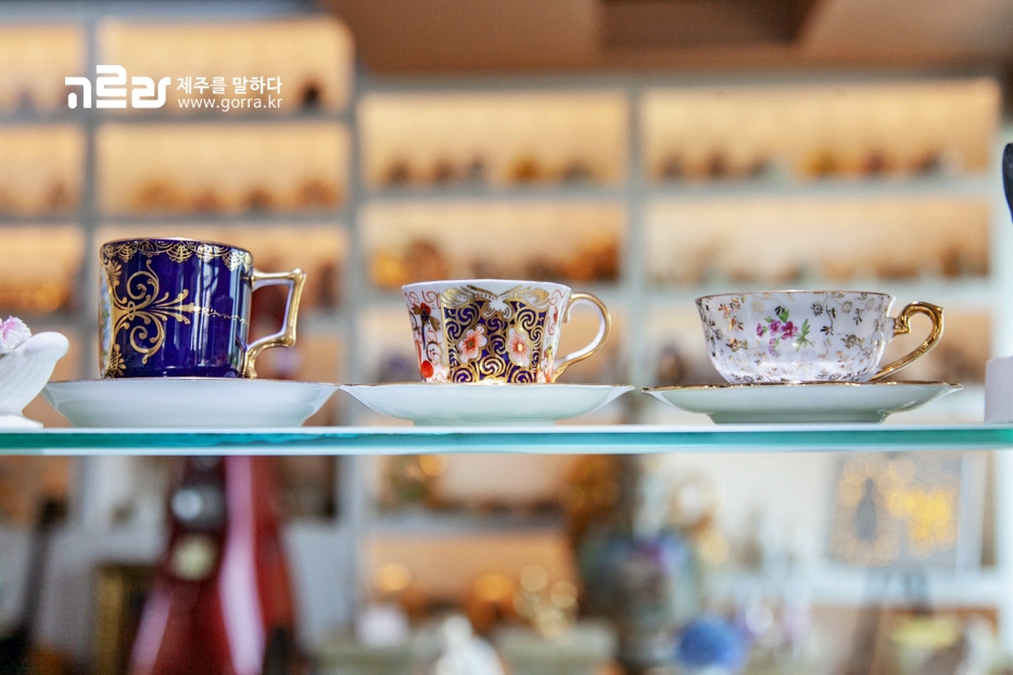 마노르블랑 카페 내부는 영국의 고풍스러운 티웨어와 소품으로 가득한데요. 유럽 귀족문화를 느낄 수 있는 테마로 꾸며져 있다고 할 수 있습니다. 카페 한편에는 수국 파우치, 방향제 등 제주 관련 소품들도 진열해 판매하고 있어요.