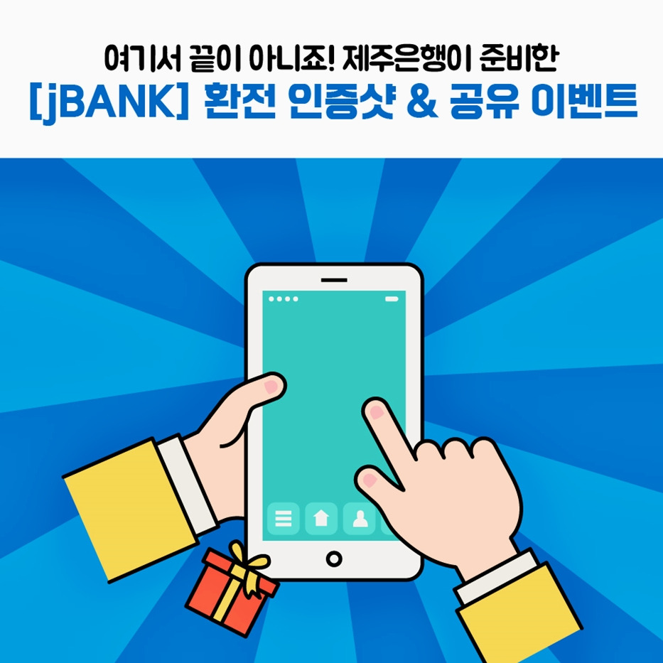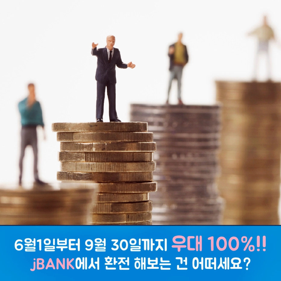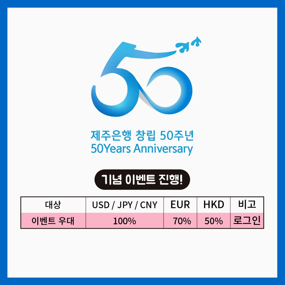 이와 관련해 제주은행이 창립 50주년을 기념, 2019년 6월 1일부터 2019년 9월 30일까지 4개월 동안 jBANK 어플을 통해 주요 통화 환전 우대율 최대 100% 이벤트를 진행하고 있습니다.
