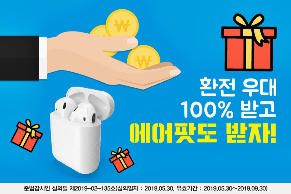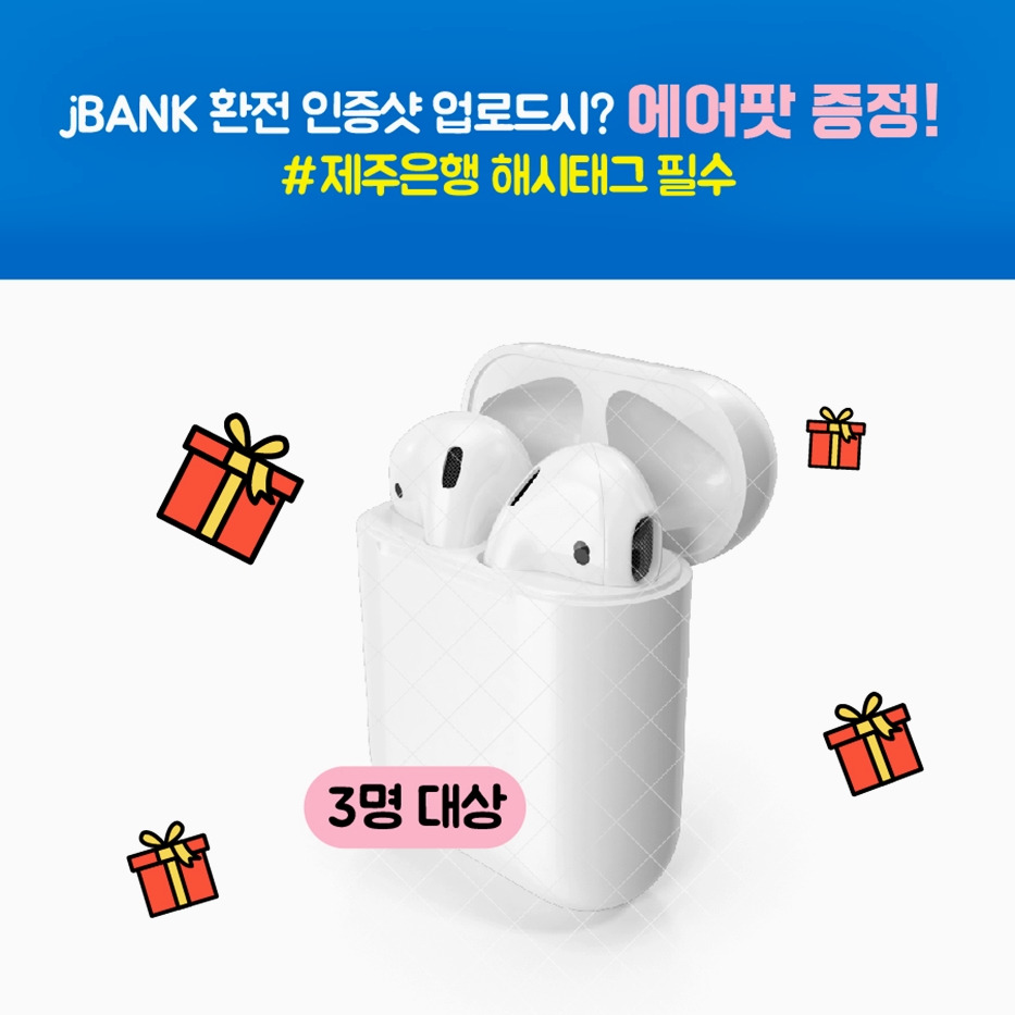 무엇보다도 jBANK 환전 서비스 이용 고객에게는 다양한 추가 혜택이 제공되는데요. 2019년 6월 1일부터 2019년 6월 31일까지 jBANK 환전 인증샷&공유 이벤트가 진행되고 있어요. 두 가지 방법 중 하나를 골라 참여하면 되는데요. 상품은 무려 에어팟!