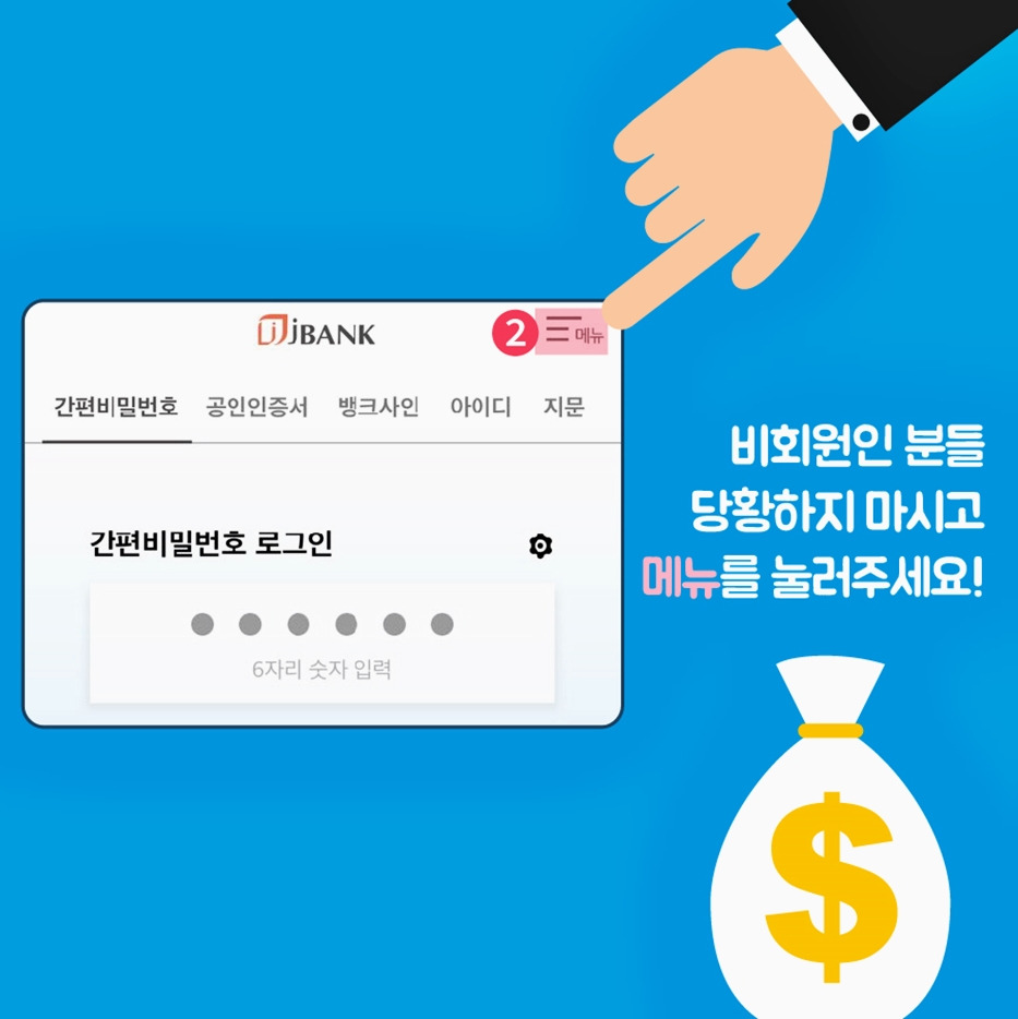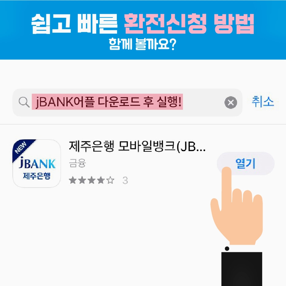 jBANK를 플레이스토어 또는 앱스토어에서 다운로드 받아 실행하고, 전체메뉴에서 외환 누구나 환전을 선택하면 24시간 환전 신청이 가능한데요. 회원은 로그인 후 환전 신청 정보를 입력하고, 외화 수령점 입력, 신청내용 확인 및 출금계좌 비밀번호 입력 등을 마치면 신청 완료!
