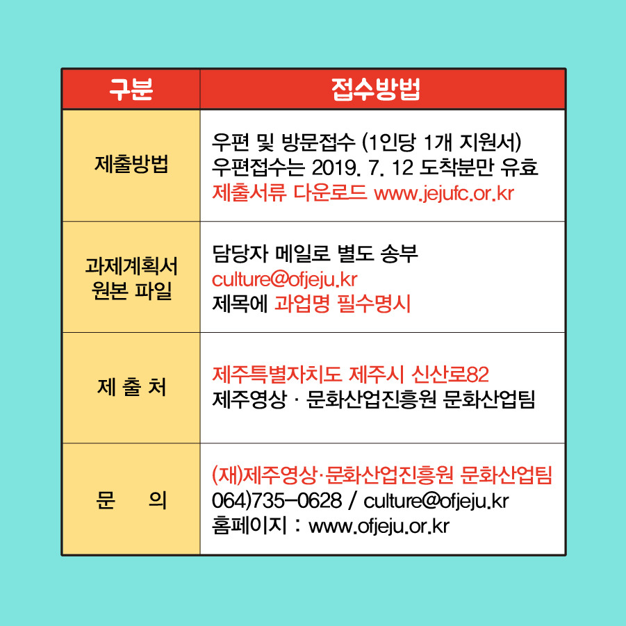 서류는 우편 또는 방문접수 방식으로 제출이 가능한데요. 제주시 신산로 제주영상·문화산업진흥원 건물 내 문화산업팀을 찾으면 된답니다. 신청자 당 1개 지원서만 제출할 수 있어요. 우편접수는 2019년 7월 12일 도착분에 한해 접수합니다.