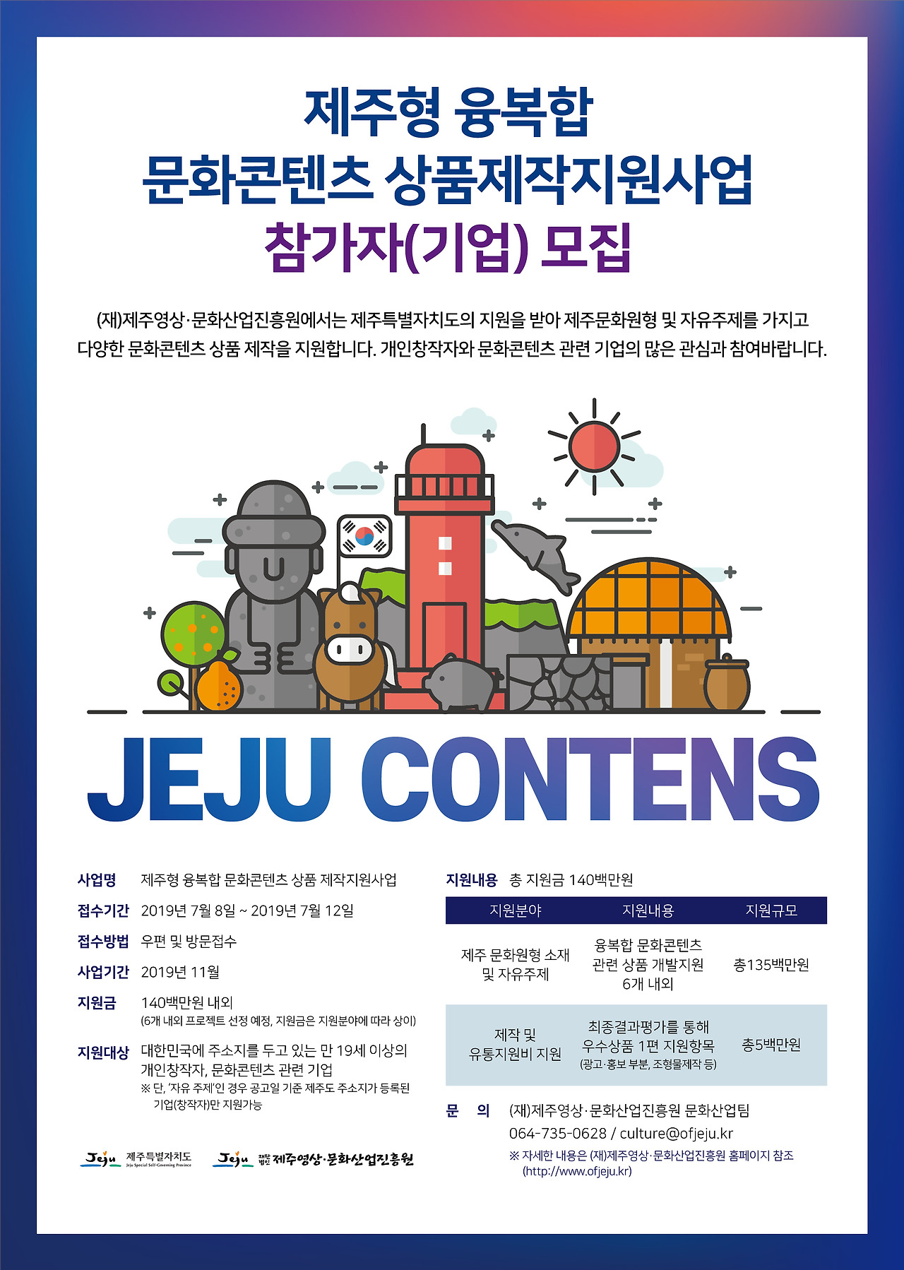 ‘제주형 융복합 문화콘텐츠 상품제작 지원 사업’은 (재)제주영상·문화산업진흥원이 제주도의 지원을 받아 추진하는 사업인데요. 새로운 제주문화 콘텐츠 상품을 발굴하고, 도내 문화콘텐츠 기업 및 창작자를 육성하기 위해 마련됐답니다.