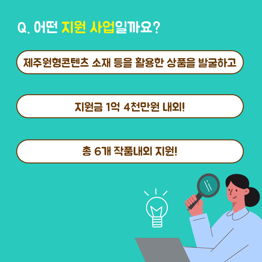 이번 사업은 해녀, 돌 등 제주문화원형 및 자유주제를 소재로 한 문화콘텐츠 상품을 발굴하고, 시장 진출을 위한 상품개발비를 지원하는데요. 특히 사업을 통해 발굴된 창작품에 대한 홍보·유통·지원까지! 다각적 사후 지원이 이어진다는 점이 중요한 포인트예요.