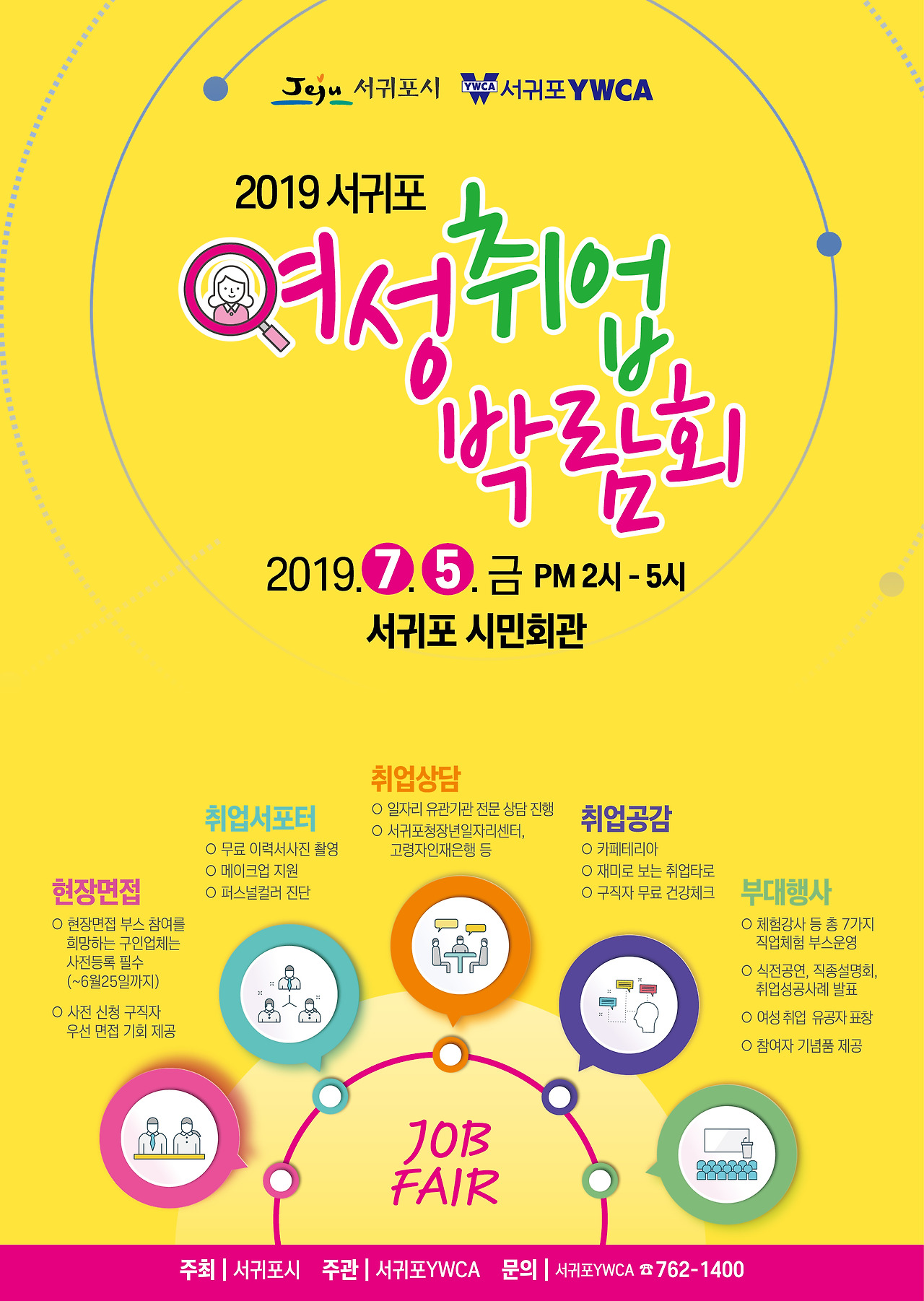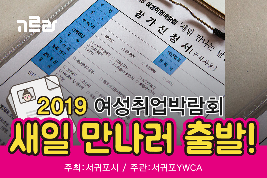 일자리 발굴 및 구직여성의 사회 참여를 유도하기 위해 마련된 <2019 서귀포여성취업박람회>에 여러분의 많은 관심과 참여 바랍니다. 자세한 사항은 서귀포YWCA(☎064-762-1400)로 문의하거나 홈페이지(www.sgpoywca.or.kr)를 참고해주세요!