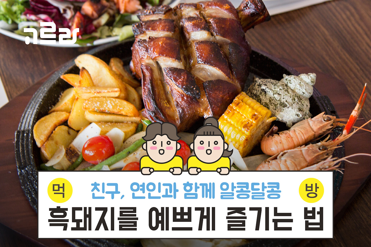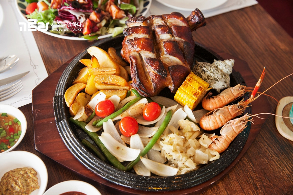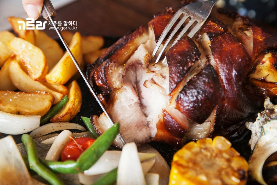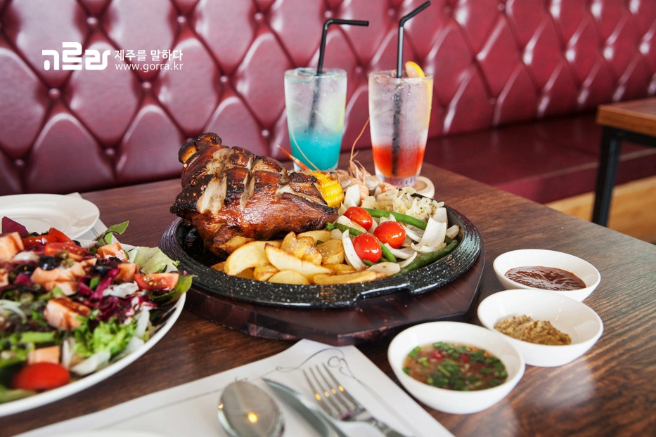 이곳 대표 메뉴인 흑돼지학센은 독일 슈바인 학센을 제주흑돼지로 만든 요리입니다. 제주 로컬푸드인 뿔소라와 딱새우가 먹음직스럽게 플레이팅된 메뉴인데요. 한 가지 메뉴로 3가지 제주 특산물을 맛볼 수 있는 음식입니다. 겉껍질은 크런치하게 깨지고 속은 육즙으로 가득 찬 제대로 된 학센! 칼로 쓱쓱 썰어먹는 재미가 쏠쏠합니다.