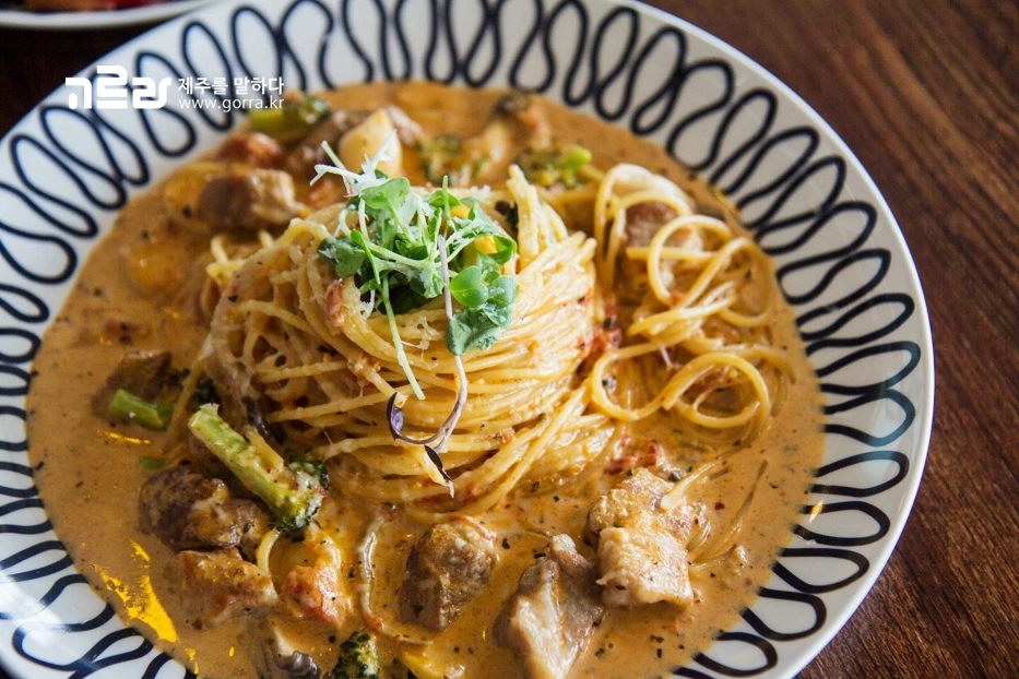 흑돼지로제파스타는 제주흑돼지가 듬뿍 들어간 로제파스타입니다. 크림과 토마토를 오묘하게 조합한 로제파스타는 담백하고 깊은 감칠맛을 지니고 있습니다.