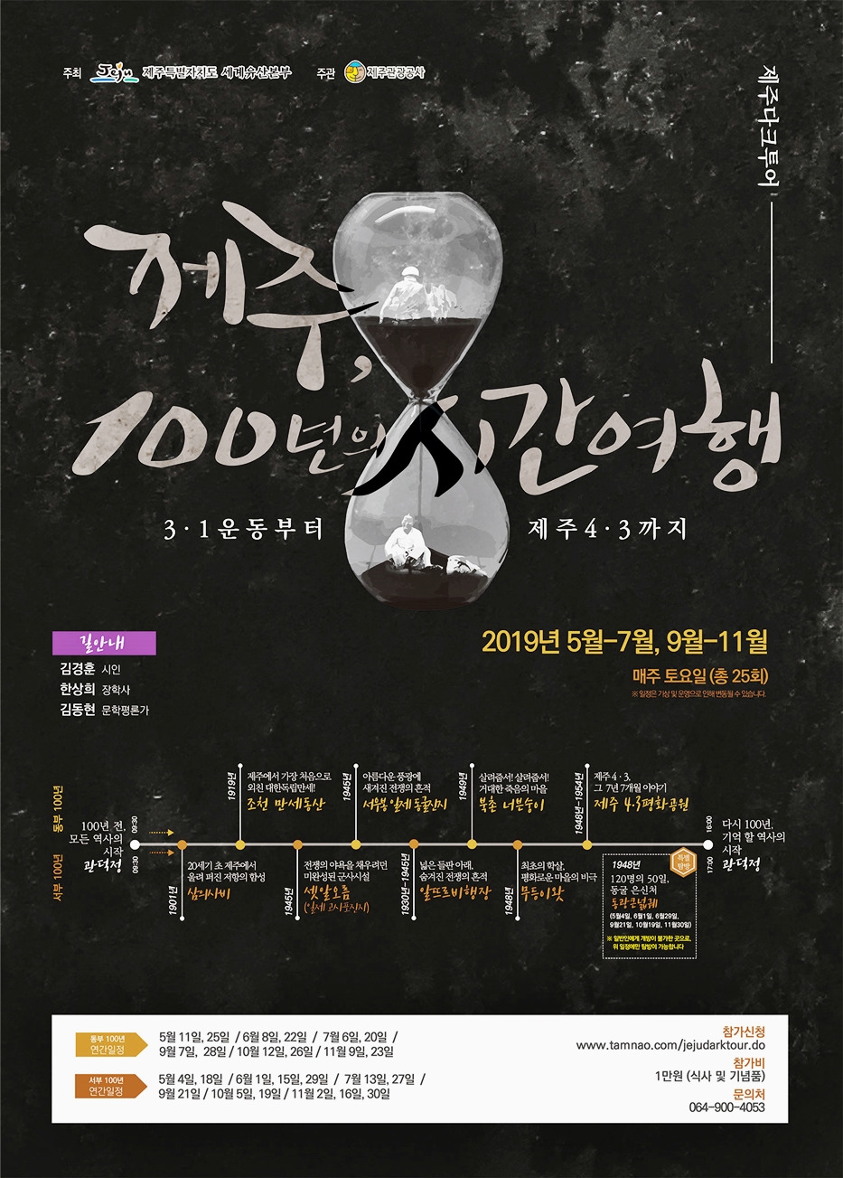 ‘제주 100년의 시간여행’은 3.1운동부터 제주4.3사건까지의 사건들을 살펴보는 다크투어 프로그램입니다. 주요 역사 흐름을 동부100길 또는 서부100길 투어를 통해 살펴보는 여행 코스인데요. 김경훈 시인, 한상희 장학사, 김동현 문학박사가 해설사로 나선답니다.