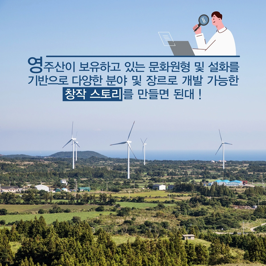 자세한 사항 및 별첨 자료는 (재)제주영상문화산업진흥원 홈페이지 공고를 참고하세요! 영주산이 품은 뛰어난 가치와 자신만의 스토리를 버무려 더 큰 가치를 창조하는 이번 스토리텔링 공모에 도전해보는 건 어떨까요?