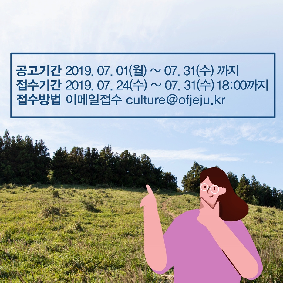 이번 공모는 대한민국에 거주하고 있는 국민이라면 누구나 응모할 수 있답니다. (재)제주영상·문화산업진흥원 홈페이지 공고는 2019년 7월 1일부터 7월 31일까지 한 달간, 접수 기간은 2019년 7월 24일부터 7월 31일까지 8일간 이어집니다.